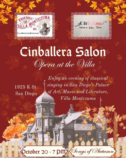 The talented artists of Cinballera (who love cinema, ballet and opera) return to the Villa Montezuma each month for a marvelous evening of opera for those who want to hear great singing in a more intimate setting. Open seating in the gorgeous Music Room is limited to 32 guests. Doors open at 6:45 p.m., performances are from 7:00 - 9:00 p.m. Questions? Emailing our organizations at admin@cinballera.org and the Friends of the Villa Montezuma at FOVM@VillaMontezumaMuseum.org. After we pay the pianist and performers the proceeds are shared between the two nonprofit organizations. Bonus: Guests get to return to see the entire museum! Free street parking in this residential neighborhood. (Park tight, not suburban!) Bring a friend to these magical evenings!