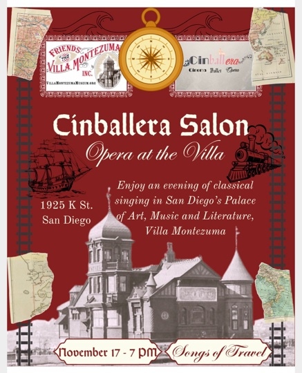 The talented artists of Cinballera (who love cinema, ballet and opera) return to the Villa Montezuma each month for a marvelous evening of opera for those who want to hear great singing in a more intimate setting. Open seating in the gorgeous Music Room is limited to 32 guests. Doors open at 6:45 p.m., performances are from 7:00 - 9:00 p.m. Questions? Emailing our organizations at admin@cinballera.org and the Friends of the Villa Montezuma at FOVM@VillaMontezumaMuseum.org. Performers include soprano Amy Long, tenor Alexis Alfaro, bass Bryan Dahl, tenor Shawn Taylor, mezzo soprano Rebekah Brannan, and soprano Tiffany Brannan. Pianist for this performance is Rodney Girvin. After we provide an honorarium for the pianist and performers the proceeds are shared between the two nonprofit organizations. Bonus: Guests get to return to see the entire museum! Free street parking in this residential neighborhood. (Park tight, not suburban!) Bring a friend to these magical evenings!