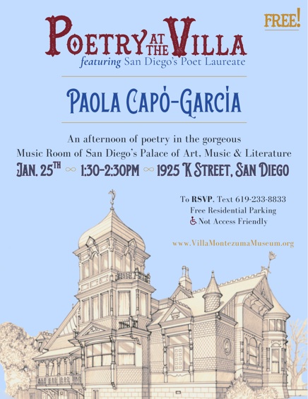 We’re fully booked! Paola Capo-Garcia, Poet Laureate of San Diego: Sunday, January 25, 2026, 1:30 p.m., “Poetry at the Villa!” Free. Reserve your spot by texting 619-233-8833!